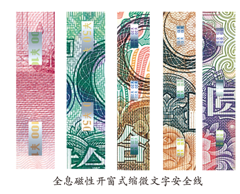 人民币从第四套1990年版开始运用安全线这项防伪技术,1990年版50元、100元,使用普通全埋式安全线。第五套1999年版的安全线,开始加印缩微文字和全息文字。100元、50元为磁性缩微文字安全线,20元为磁性间断式安全线(无字),10元和5元首次使用全息磁性开窗式安全线。安全线的植入方式由全埋式改为开窗式,所谓开窗,是指线体材料等距间断埋入纸中和裸露在纸表面;材料由单一的聚酯材料改为有闪光效果的复合材料。